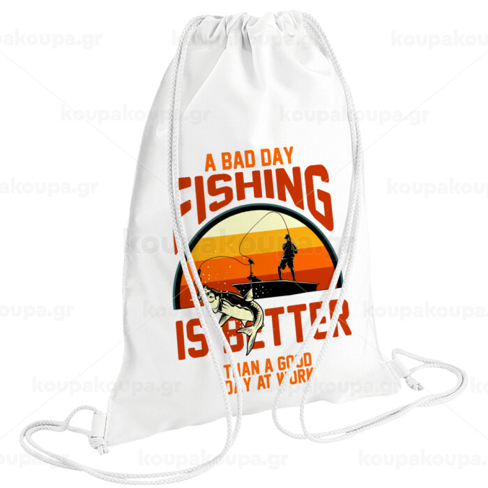 A bad day FISHING is better than a good day at work, Τσάντα πλάτης πουγκί GYMBAG λευκή (28x40cm)
