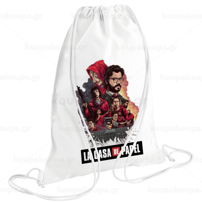 La casa de papel drawing cover, Τσάντα πλάτης πουγκί GYMBAG λευκή (28x40cm)