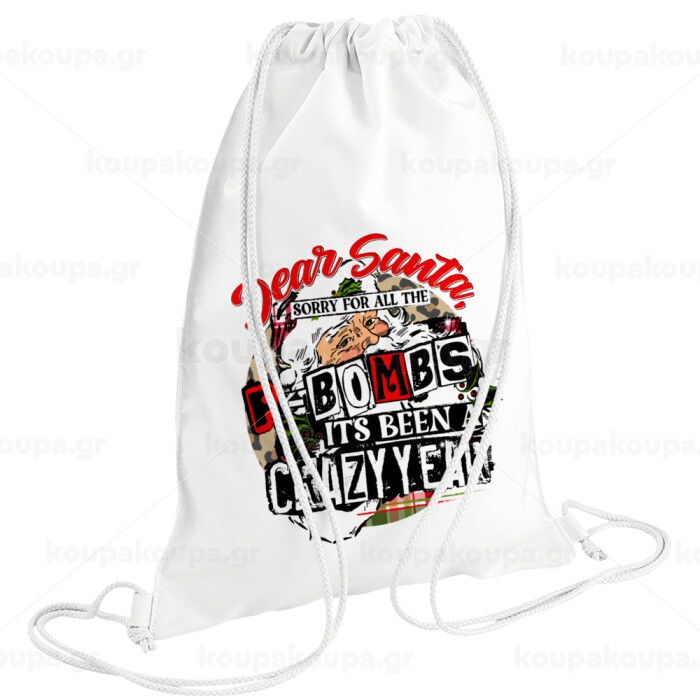 Dear Santa, sorry for all the F-bombs, Τσάντα πλάτης πουγκί GYMBAG λευκή (28x40cm)