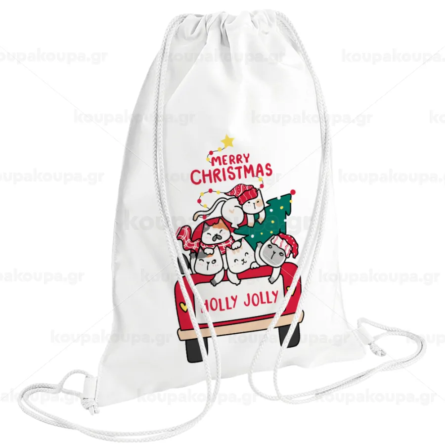 Merry Christmas cats in car, Τσάντα πλάτης πουγκί GYMBAG λευκή (28x40cm)