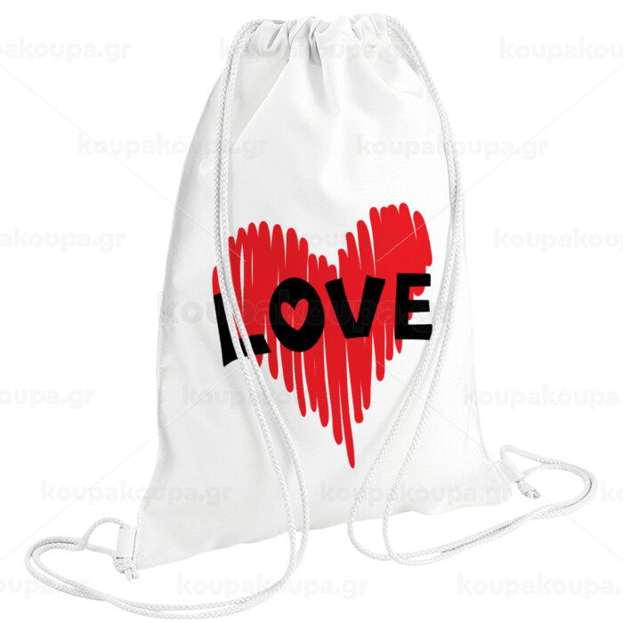 I Love You red heart, Τσάντα πλάτης πουγκί GYMBAG λευκή (28x40cm)