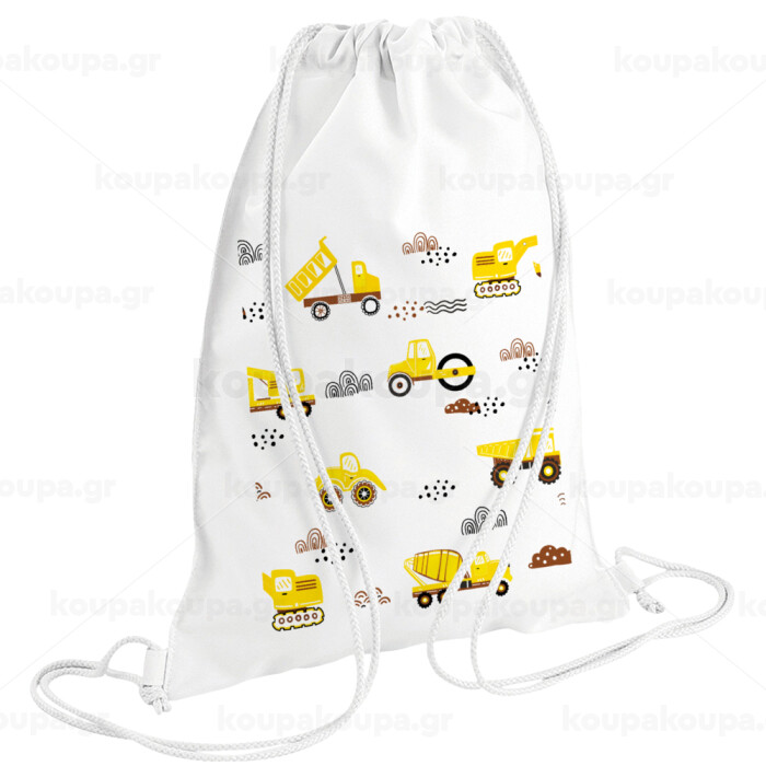 Αμαξάκια φορτωτές και μπουλντόζες, Τσάντα πλάτης πουγκί GYMBAG λευκή (28x40cm)