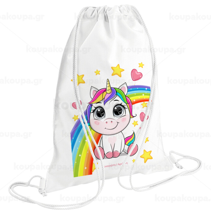 Unicorn baby με όνομα, Τσάντα πλάτης πουγκί GYMBAG λευκή (28x40cm)