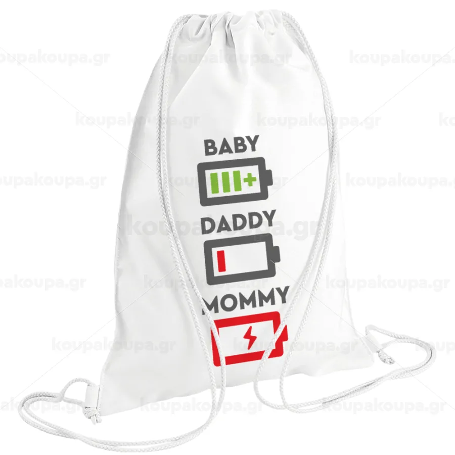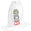 BABY, MOMMY, DADDY Low battery, Τσάντα πλάτης πουγκί GYMBAG λευκή (28x40cm)