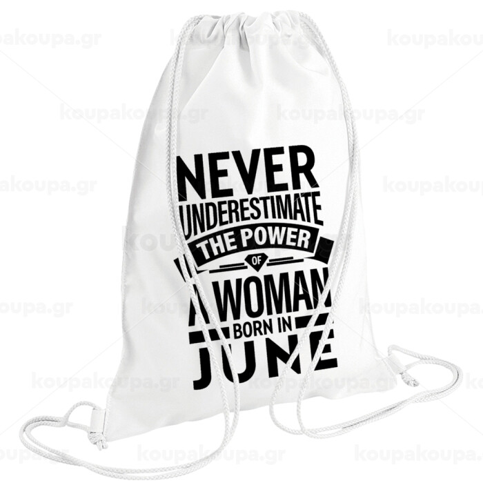 Never Underestimate the poer of a Woman born in..., Τσάντα πλάτης πουγκί GYMBAG λευκή (28x40cm)