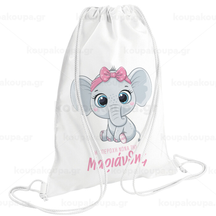 Η νονά μου, ελεφαντάκι ροζ, Τσάντα πλάτης πουγκί GYMBAG λευκή (28x40cm)