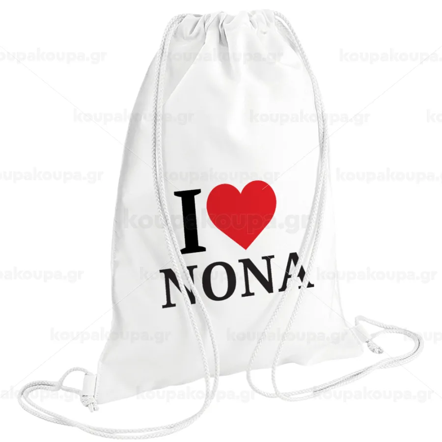 I Love ΝΟΝΑ, Τσάντα πλάτης πουγκί GYMBAG λευκή (28x40cm)