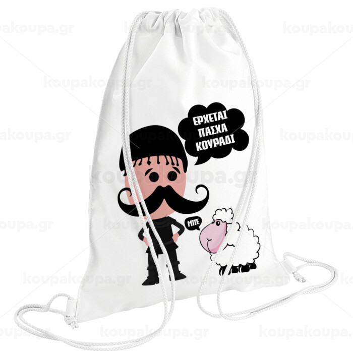 Κρητικός "Έρχεται Πάσχα κουράδι", Τσάντα πλάτης πουγκί GYMBAG λευκή (28x40cm)