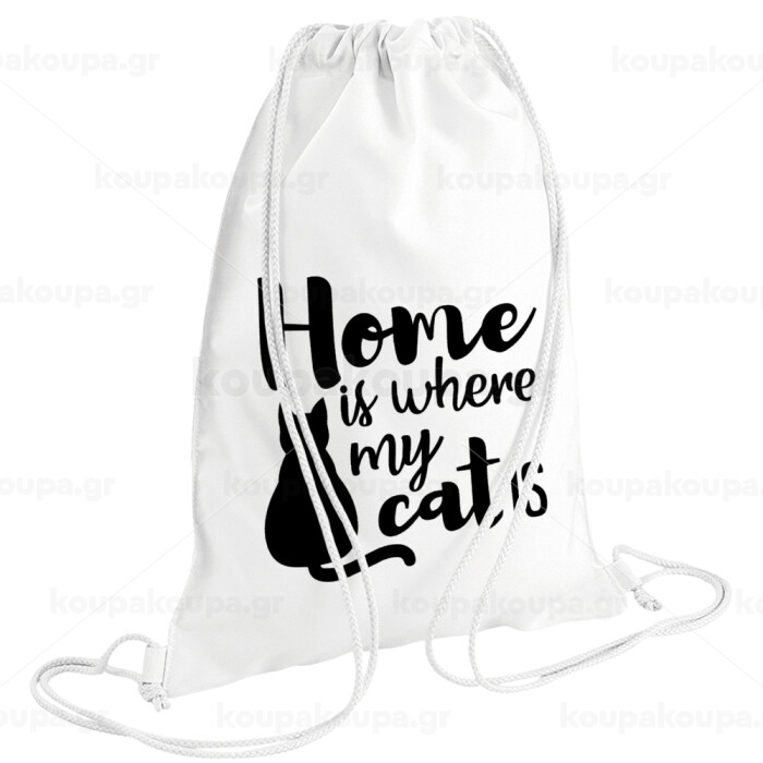 Home is where my cat is!, Τσάντα πλάτης πουγκί GYMBAG λευκή (28x40cm)