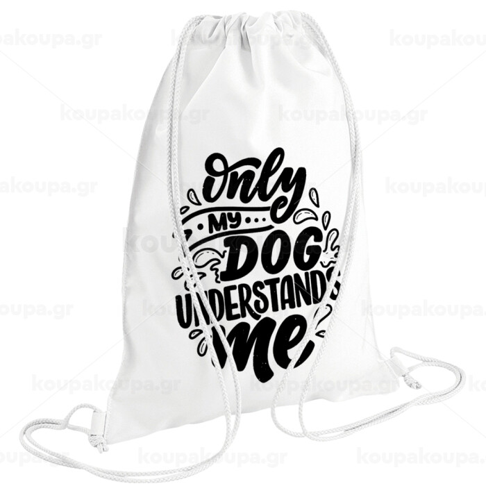 Only my DOG, understands me, Τσάντα πλάτης πουγκί GYMBAG λευκή (28x40cm)