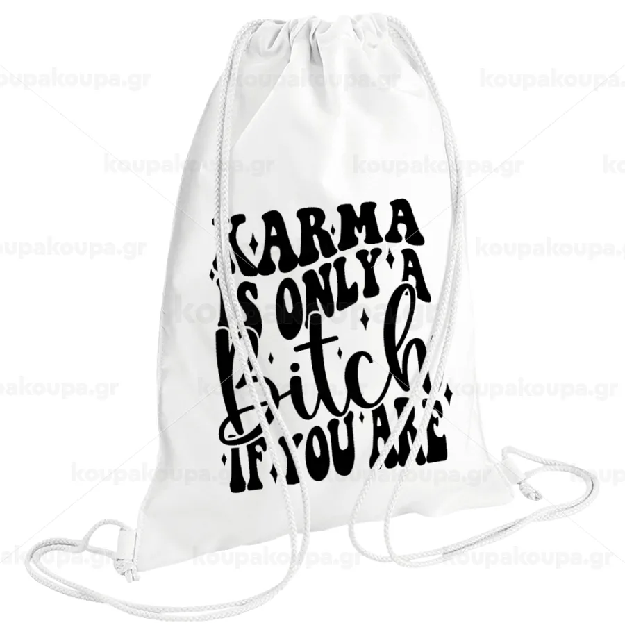 Karma is Only A Bitch if You Are, Τσάντα πλάτης πουγκί GYMBAG λευκή (28x40cm)