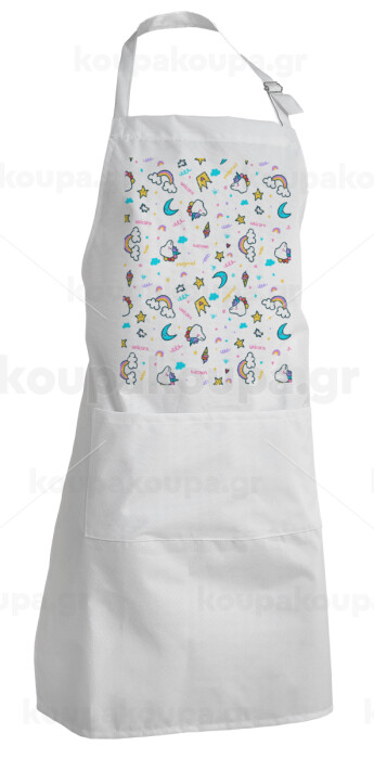 Unicorn pattern white, Ποδιά Σεφ Ολόσωμη Ενήλικων (με ρυθμιστικά και 2 τσέπες)