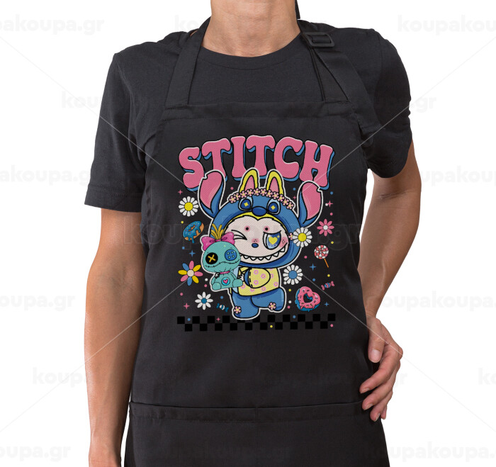 Labubu Stitch, Ποδιά μακριά Σεφ ολόσωμη με τσέπες Μαύρη (ΕΝΗΛΙΚΩΝ)