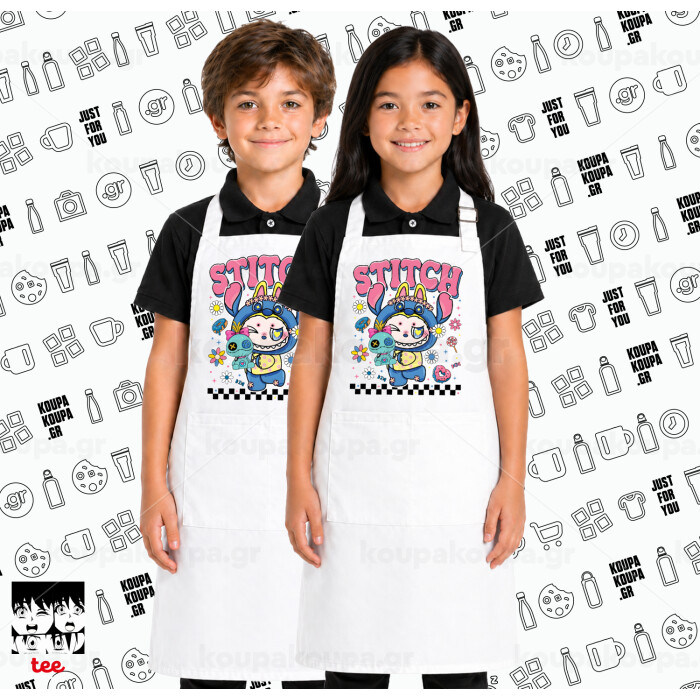 Labubu Stitch, Λευκή ΠΑΙΔΙΚΗ Ποδιά μακριά Σεφ ολόσωμη με τσέπες