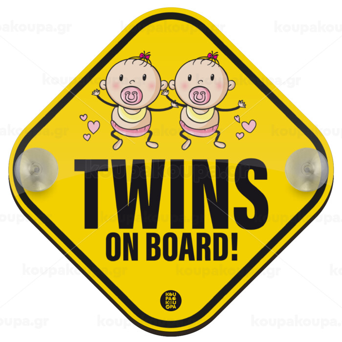 Twins on board, girls, Σήμανση αυτοκινήτου Baby On Board ξύλινο με βεντουζάκια (16x16cm)