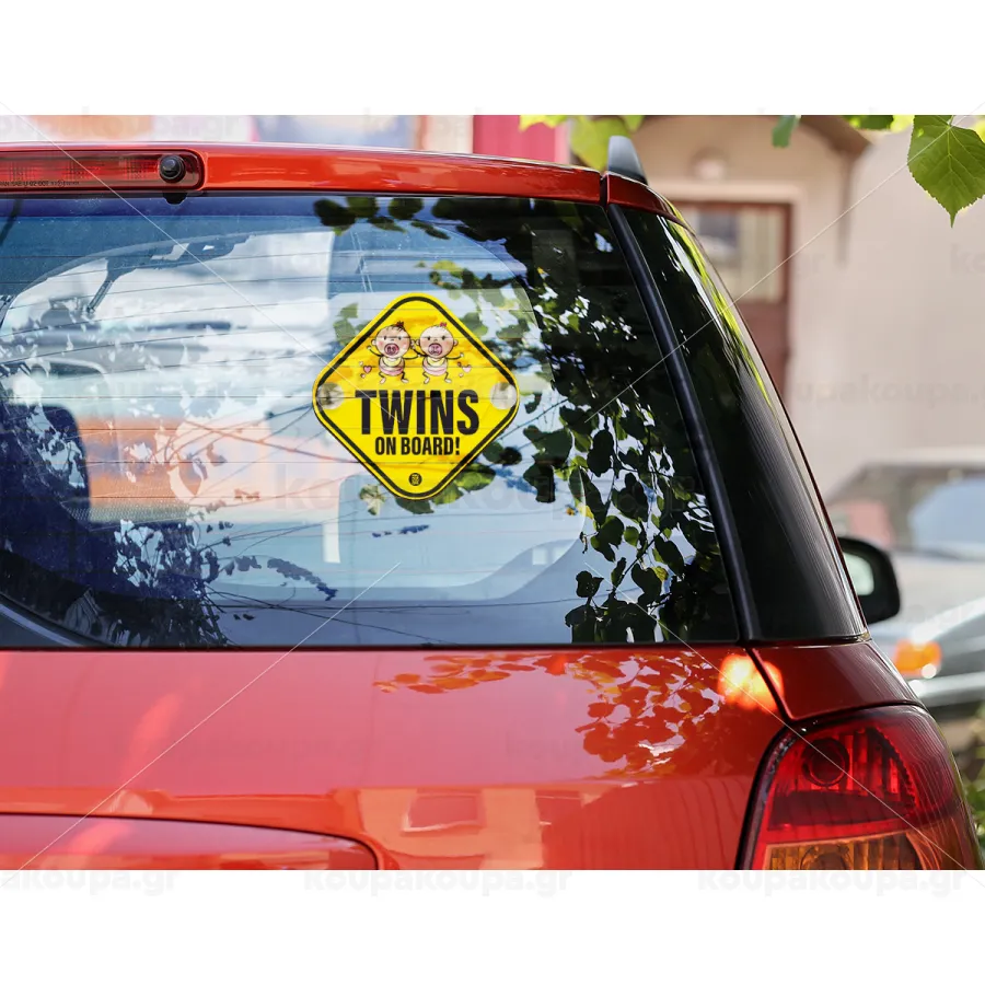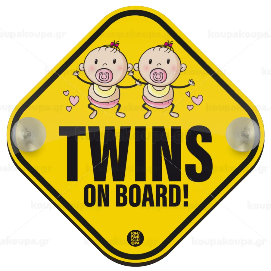 Twins on board, girls, Σήμανση αυτοκινήτου Baby On Board ξύλινο με βεντουζάκια (16x16cm)