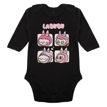 Labubu pink, Μακρυμάνικο βρεφικό φορμάκι, 0-18 μηνών, ΜΑΥΡΟ, 100% Organic Cotton