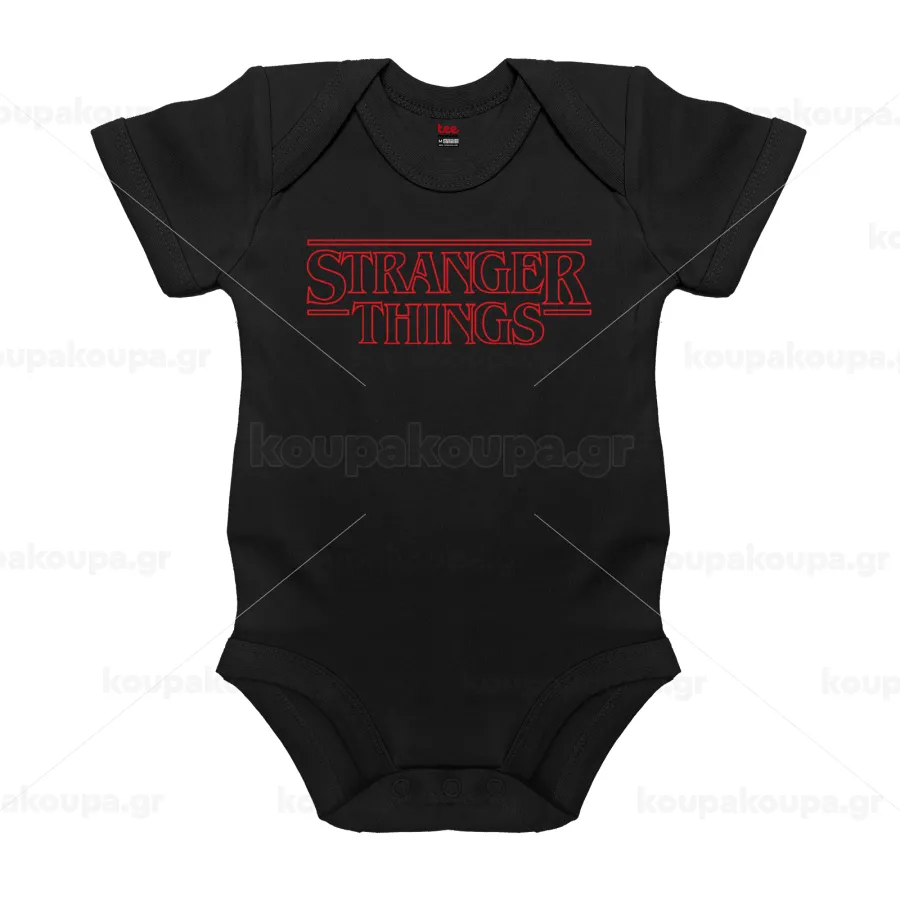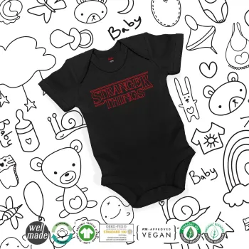 Stranger Things Logo, Βρεφικό φορμάκι μωρού, 0-18 μηνών, ΜΑΥΡΟ, 100% Organic Cotton, κοντομάνικο