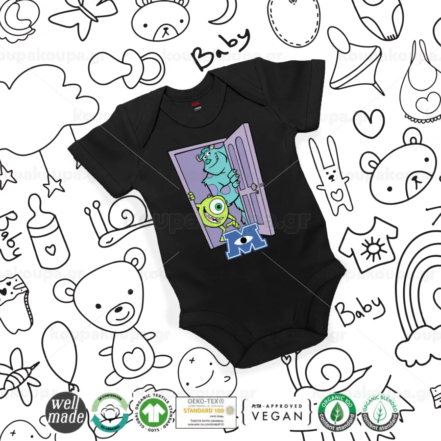 Monster inc, Βρεφικό φορμάκι μωρού, 0-18 μηνών, ΜΑΥΡΟ, 100% Organic Cotton, κοντομάνικο