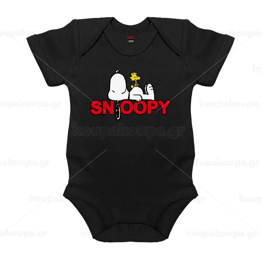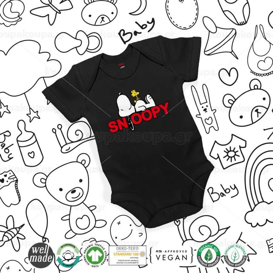 Snoopy sleep, Βρεφικό φορμάκι μωρού, 0-18 μηνών, ΜΑΥΡΟ, 100% Organic Cotton, κοντομάνικο