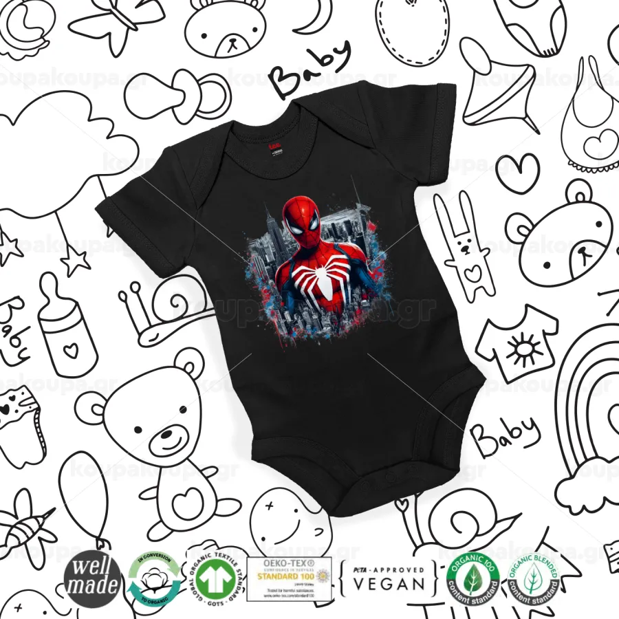 Spiderman City, Βρεφικό φορμάκι μωρού, 0-18 μηνών, ΜΑΥΡΟ, 100% Organic Cotton, κοντομάνικο