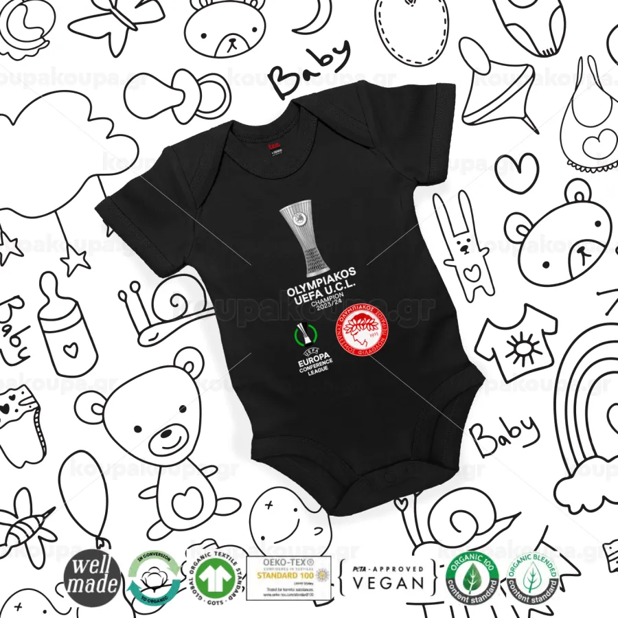 Ολυμπιακός νικητής UEFA Europa Conference League Champion 2023/24, Βρεφικό φορμάκι μωρού, 0-18 μηνών, ΜΑΥΡΟ, 100% Organic Cotton, κοντομάνικο