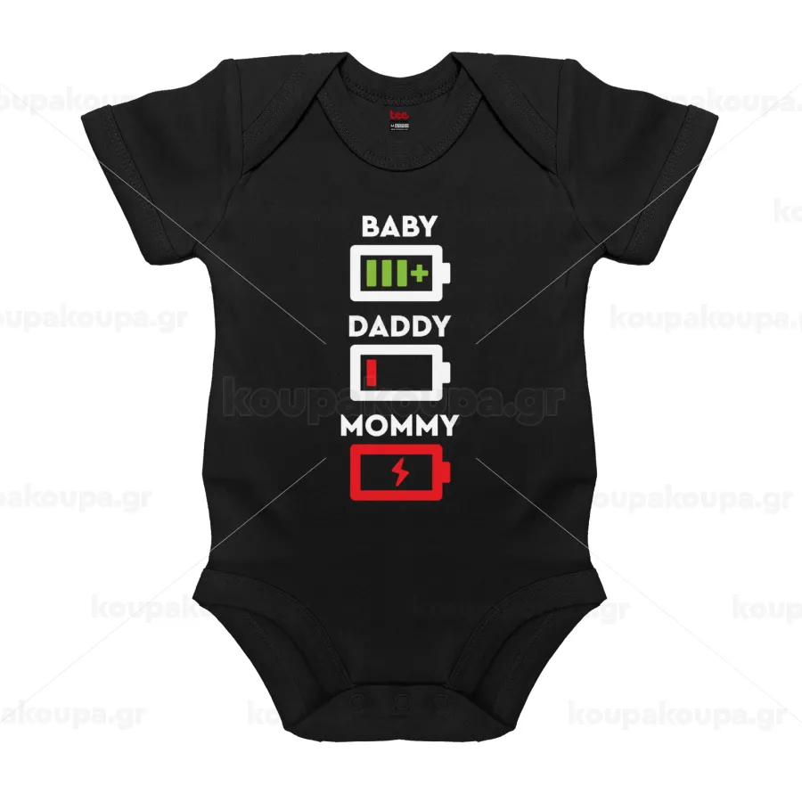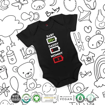 BABY, MOMMY, DADDY Low battery, Βρεφικό φορμάκι μωρού, 0-18 μηνών, ΜΑΥΡΟ, 100% Organic Cotton, κοντομάνικο