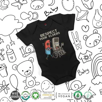 Respect your Elders, Βρεφικό φορμάκι μωρού, 0-18 μηνών, ΜΑΥΡΟ, 100% Organic Cotton, κοντομάνικο