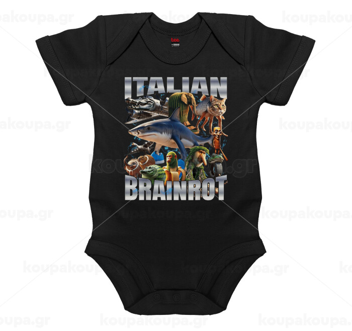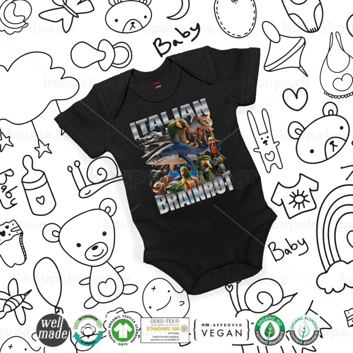 Italian Brainrot, Βρεφικό φορμάκι μωρού, 0-18 μηνών, ΜΑΥΡΟ, 100% Organic Cotton, κοντομάνικο