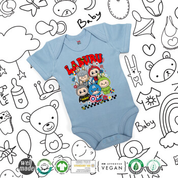 Labubu superheroes, Βρεφικό φορμάκι μωρού, 0-18 μηνών, Μπλε, 100% Organic Cotton, κοντομάνικο