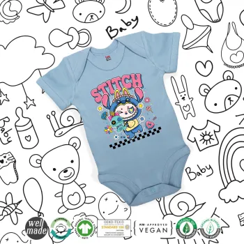 Labubu Stitch, Βρεφικό φορμάκι μωρού, 0-18 μηνών, Μπλε, 100% Organic Cotton, κοντομάνικο