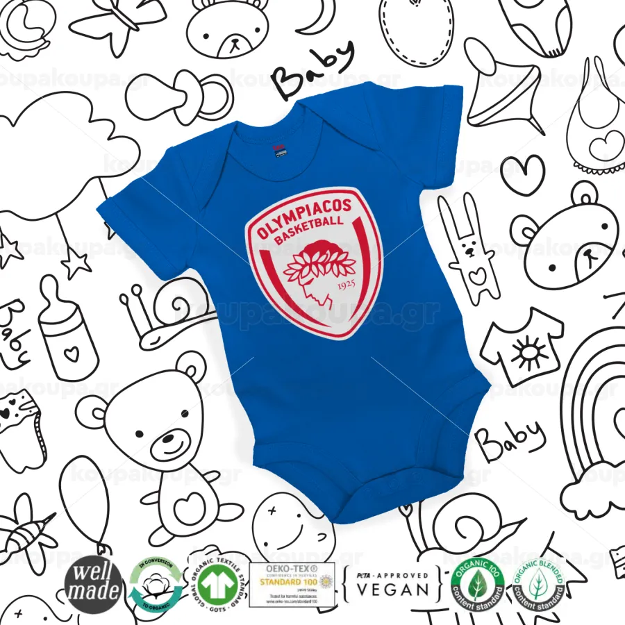 Olympiacos B.C., Βρεφικό φορμάκι μωρού, Μπλε Κοβαλτίου, 100% Organic Cotton, κοντομάνικο