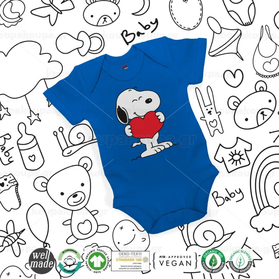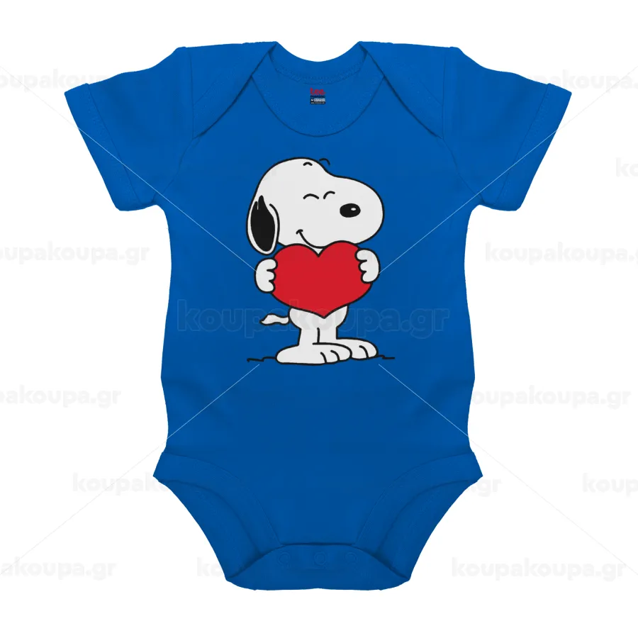 Snoopy takemy heart, Βρεφικό φορμάκι μωρού, Μπλε Κοβαλτίου, 100% Organic Cotton, κοντομάνικο