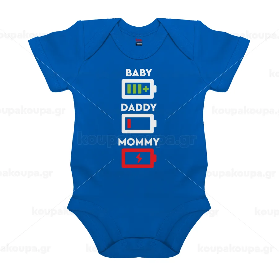 BABY, MOMMY, DADDY Low battery, Βρεφικό φορμάκι μωρού, Μπλε Κοβαλτίου, 100% Organic Cotton, κοντομάνικο
