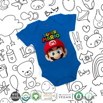 Super mario, Βρεφικό φορμάκι μωρού, Μπλε Κοβαλτίου, 100% Organic Cotton, κοντομάνικο