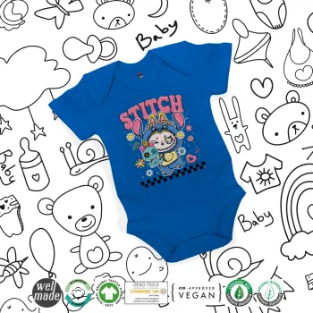 Labubu Stitch, Βρεφικό φορμάκι μωρού, Μπλε Κοβαλτίου, 100% Organic Cotton, κοντομάνικο