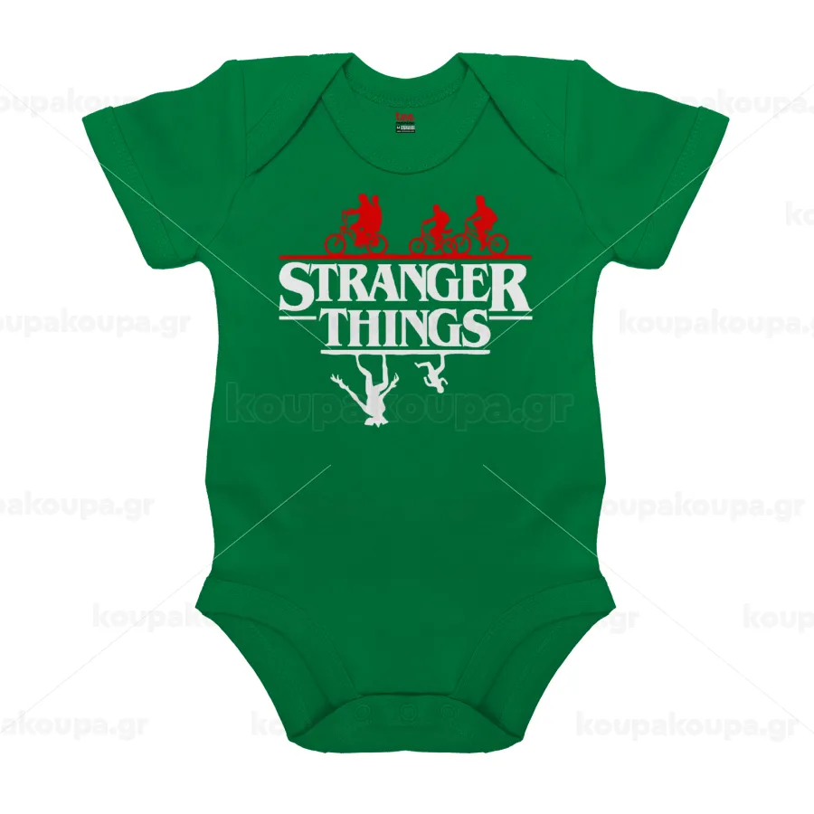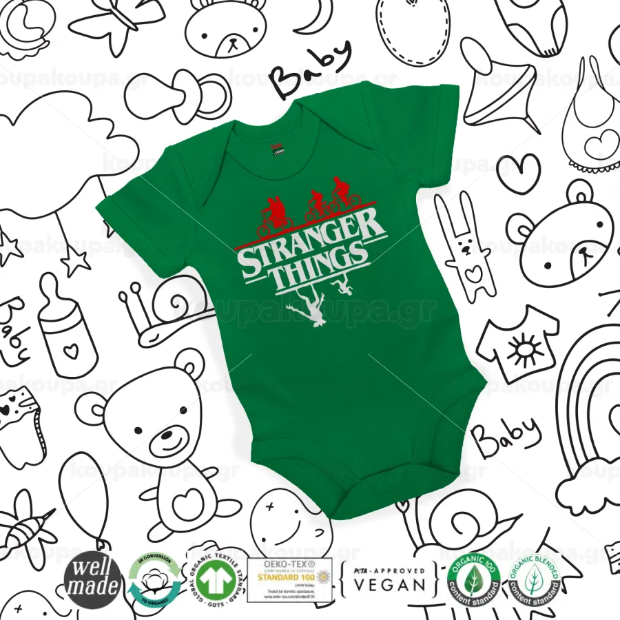 Stranger Things upside down, Βρεφικό φορμάκι μωρού, ΠΡΑΣΙΝΟ, 100% Organic Cotton, κοντομάνικο