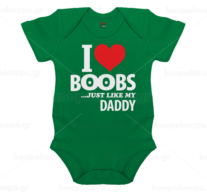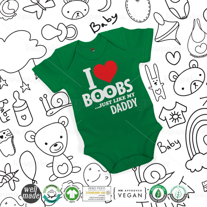 I Love boobs ...just like my daddy, Βρεφικό φορμάκι μωρού, ΠΡΑΣΙΝΟ, 100% Organic Cotton, κοντομάνικο