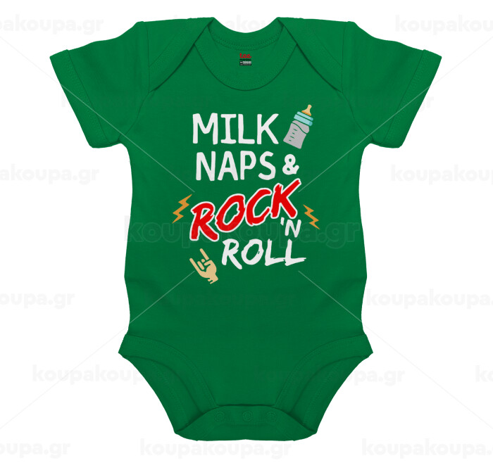 milk naps and Rock n' Roll, Βρεφικό φορμάκι μωρού, ΠΡΑΣΙΝΟ, 100% Organic Cotton, κοντομάνικο