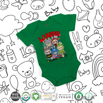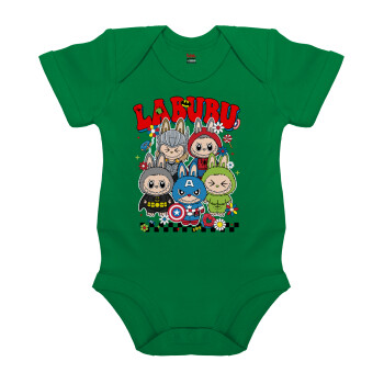 Labubu superheroes, Βρεφικό φορμάκι μωρού, ΠΡΑΣΙΝΟ, 100% Organic Cotton, κοντομάνικο