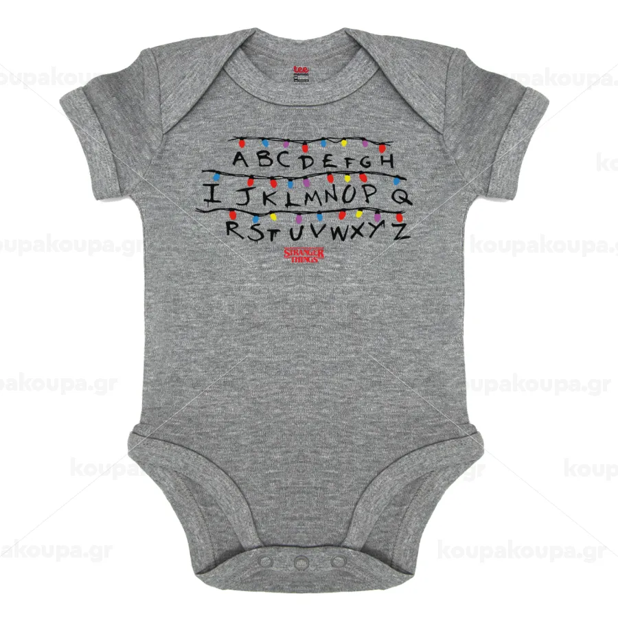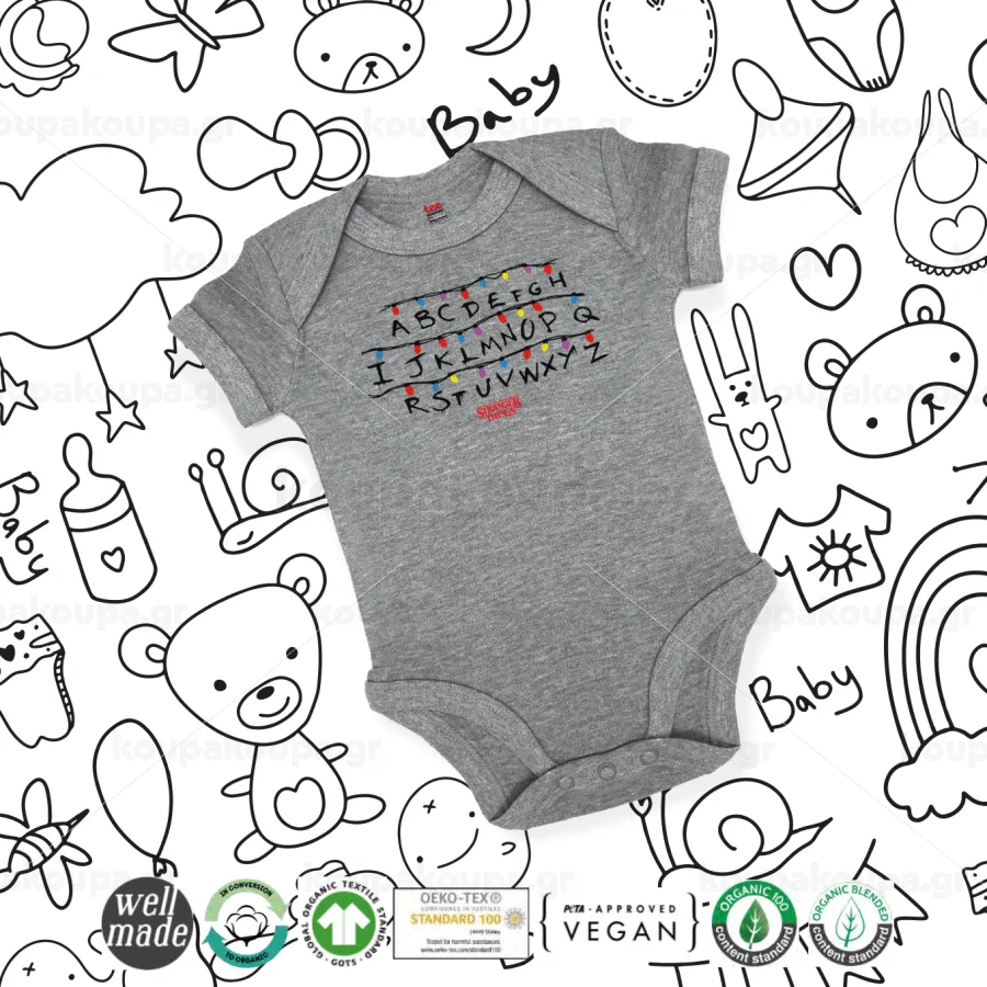 Stranger Things ABC, Βρεφικό φορμάκι μωρού, 0-18 μηνών, ΓΚΡΙ ΜΕΛΑΝΖΕ, 100% Organic Cotton, κοντομάνικο