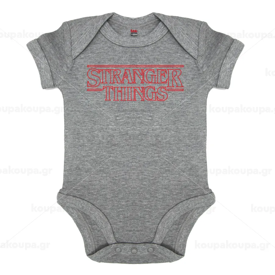 Stranger Things Logo, Βρεφικό φορμάκι μωρού, 0-18 μηνών, ΓΚΡΙ ΜΕΛΑΝΖΕ, 100% Organic Cotton, κοντομάνικο