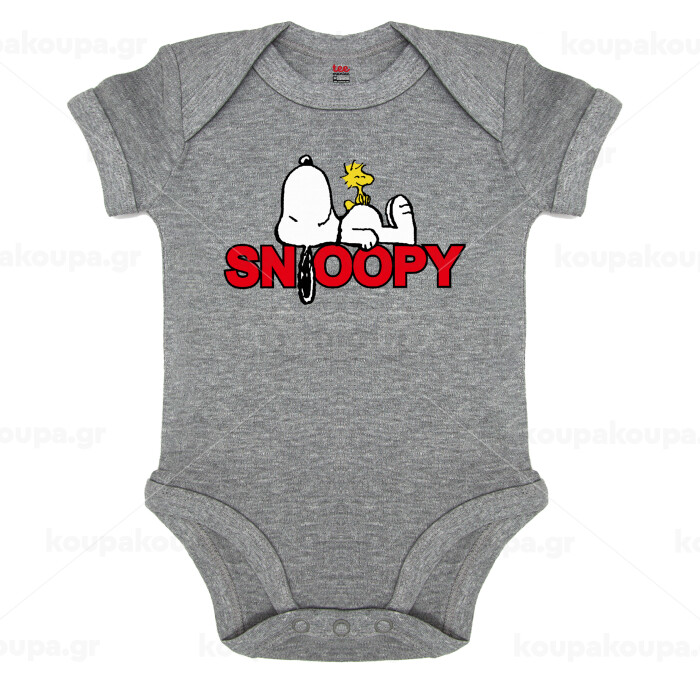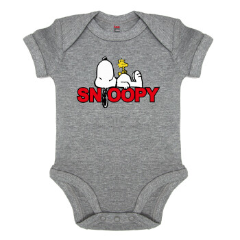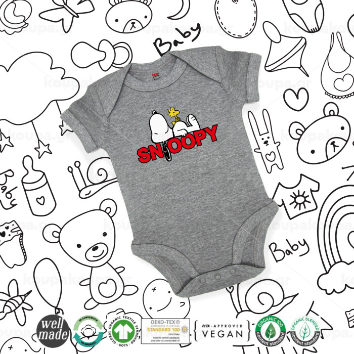 Snoopy sleep, Βρεφικό φορμάκι μωρού, 0-18 μηνών, ΓΚΡΙ ΜΕΛΑΝΖΕ, 100% Organic Cotton, κοντομάνικο
