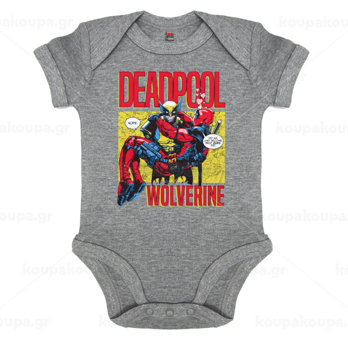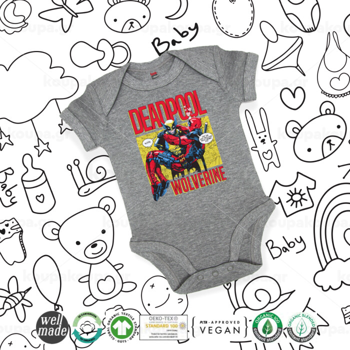 Superhero Deadpool Wolverine, Βρεφικό φορμάκι μωρού, 0-18 μηνών, ΓΚΡΙ ΜΕΛΑΝΖΕ, 100% Organic Cotton, κοντομάνικο