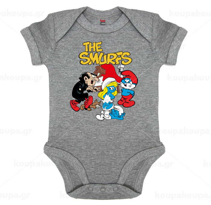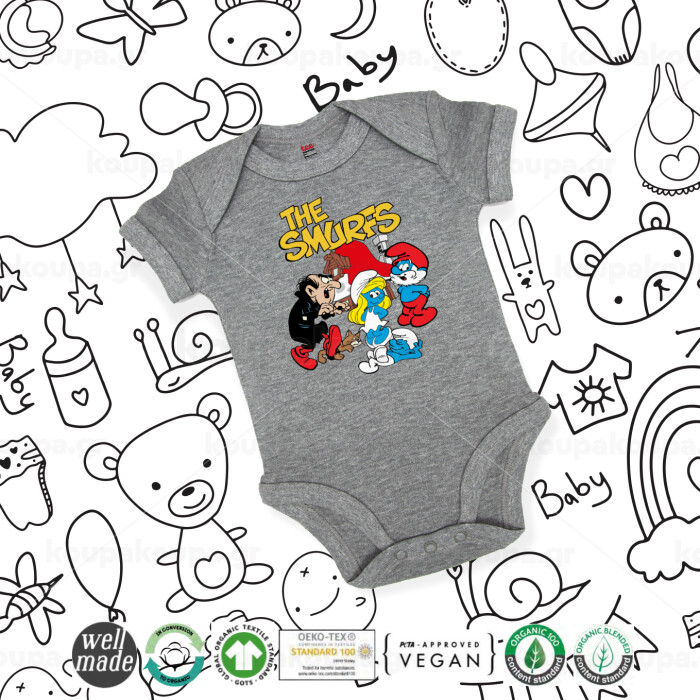 Τα στρουμφάκια, Βρεφικό φορμάκι μωρού, 0-18 μηνών, ΓΚΡΙ ΜΕΛΑΝΖΕ, 100% Organic Cotton, κοντομάνικο