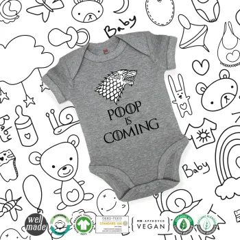 POOP Is Coming, Βρεφικό φορμάκι μωρού, 0-18 μηνών, ΓΚΡΙ ΜΕΛΑΝΖΕ, 100% Organic Cotton, κοντομάνικο