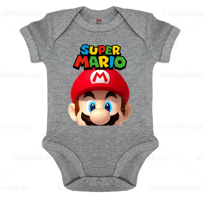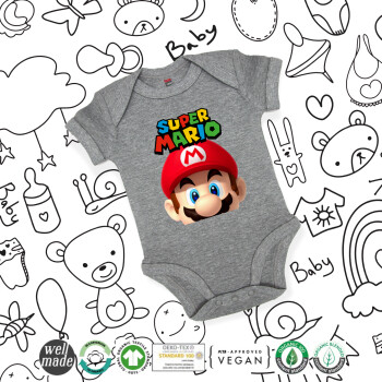 Super mario, Βρεφικό φορμάκι μωρού, 0-18 μηνών, ΓΚΡΙ ΜΕΛΑΝΖΕ, 100% Organic Cotton, κοντομάνικο