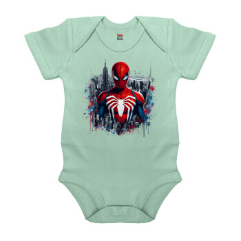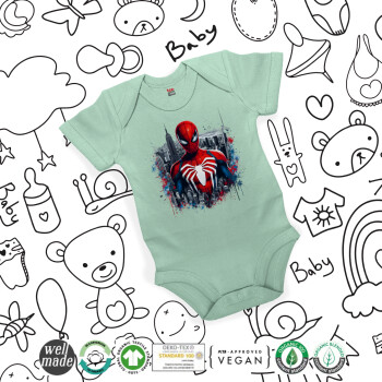 Spiderman City, Βρεφικό φορμάκι μωρού, 0-18 μηνών, mint (Μέντα), 100% Organic Cotton, κοντομάνικο