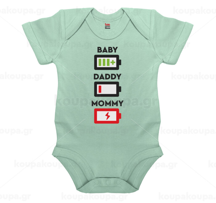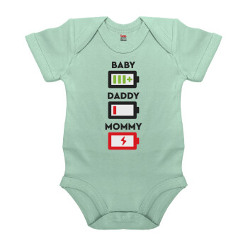 BABY, MOMMY, DADDY Low battery, Βρεφικό φορμάκι μωρού, 0-18 μηνών, mint (Μέντα), 100% Organic Cotton, κοντομάνικο