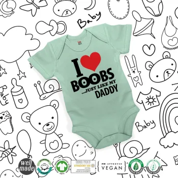 I Love boobs ...just like my daddy, Βρεφικό φορμάκι μωρού, 0-18 μηνών, mint (Μέντα), 100% Organic Cotton, κοντομάνικο